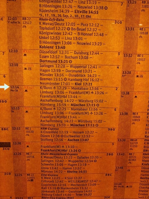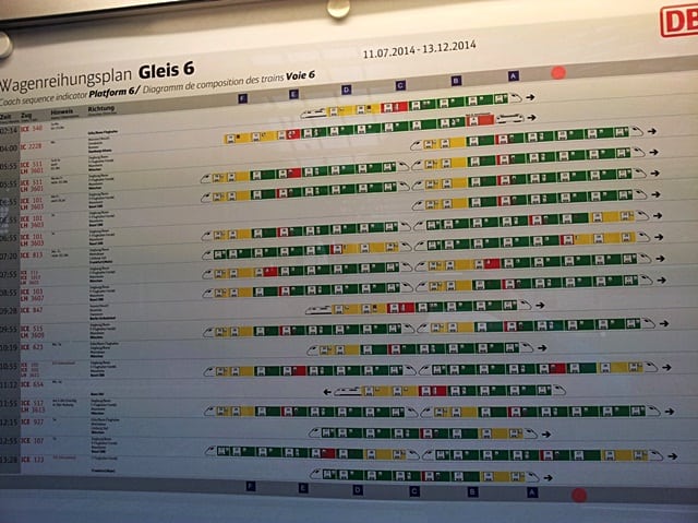 Por conta dessas mudanças todas, antes de embarcar no trem confirme se este é o vagão e o trem mesmo. Os trens InterCityExpress (ICE) possuem dispositivos luminosos no lado de fora que os identificam.
