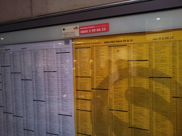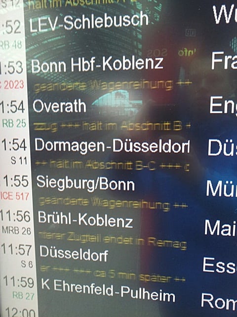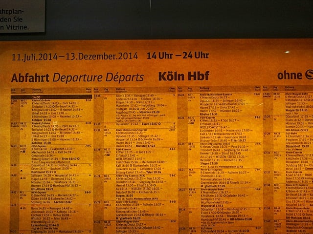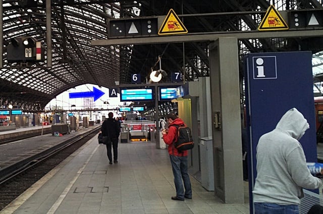 Fique atento, pois ocorrem vários atrasos e, por conta disso, pode ser que seu trem parta de outra plataforma, ou às vezes no sentido contrário (ou seja, se você embarcaria na letra A, irá embarcar na letra F – do outro lado do terminal), mas isso sempre é avisado nos alto-falantes e em dispositivos luminosos (nos terminais grandes – na foto abaixo, terminal de Colônia).